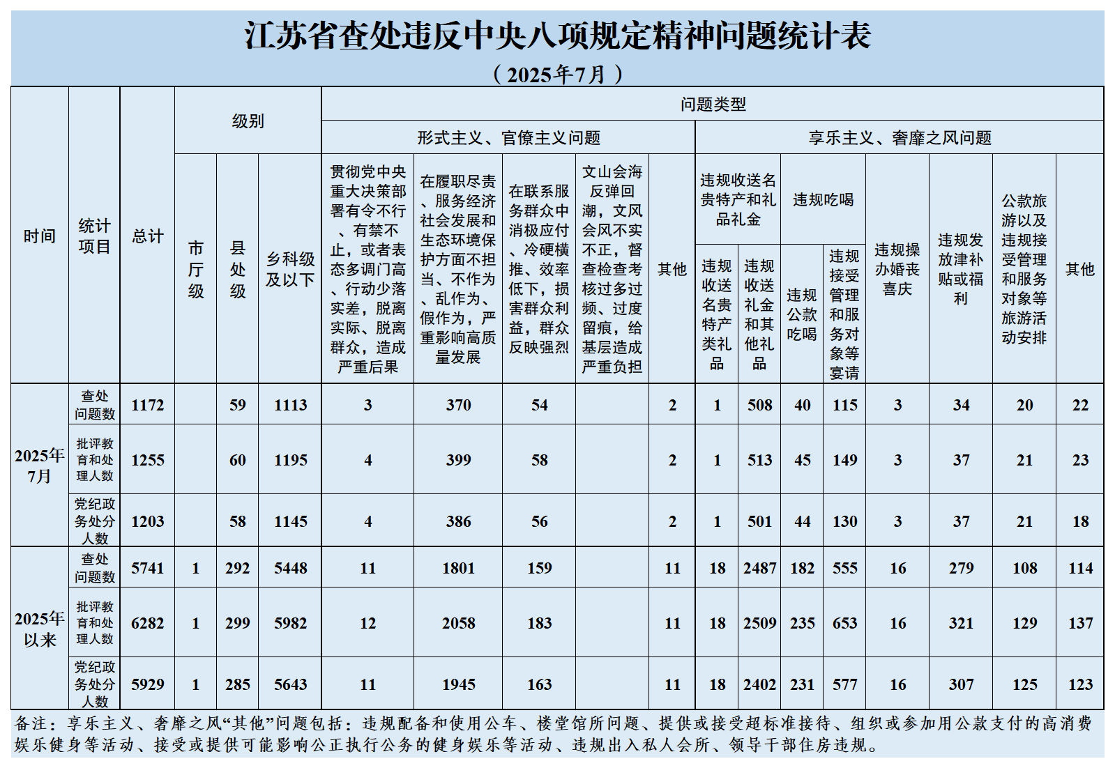 2025年7月,全省共查處違反中央八項規(guī)定精神問題1172起,批評教育和處理1255人、其中給予黨紀政務處分1203人。從問題類型看,查處形式主義、官僚主義問題429起、批評教育和處理463人,查處享樂主義、奢靡之風問題743起、批評教育和處理792人。從人員級別看,批評教育和處理縣處級干部60人、鄉(xiāng)科級及以下人員1195人。