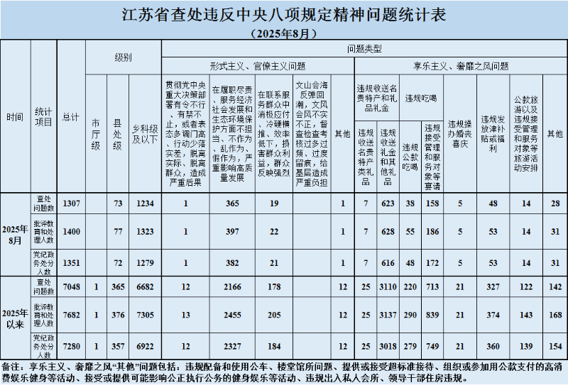 2025年8月,全省共查處違反中央八項規定精神問題1307起,批評教育和處理1400人、其中給予黨紀政務處分1351人。從問題類型看,查處形式主義、官僚主義問題386起、批評教育和處理421人,查處享樂主義、奢靡之風問題921起、批評教育和處理979人。從人員級別看,批評教育和處理縣處級干部77人、鄉科級及以下人員1323人。